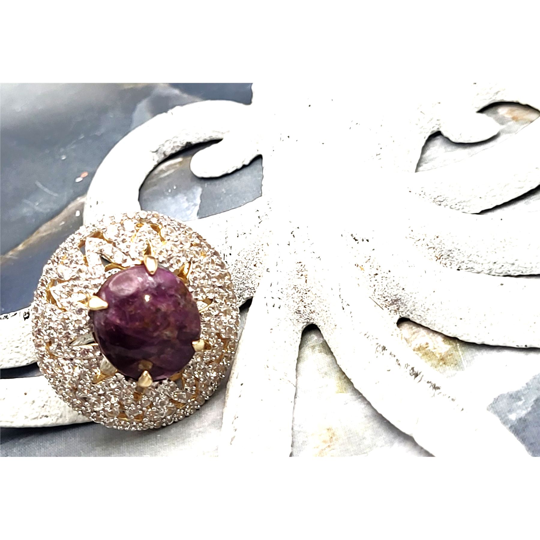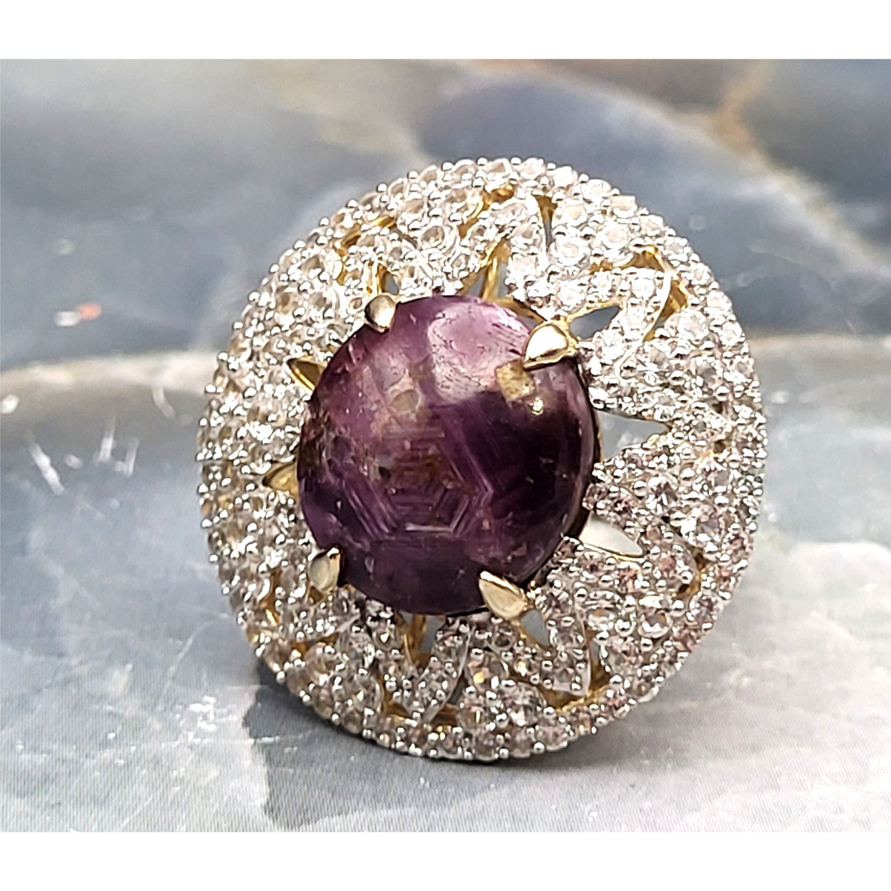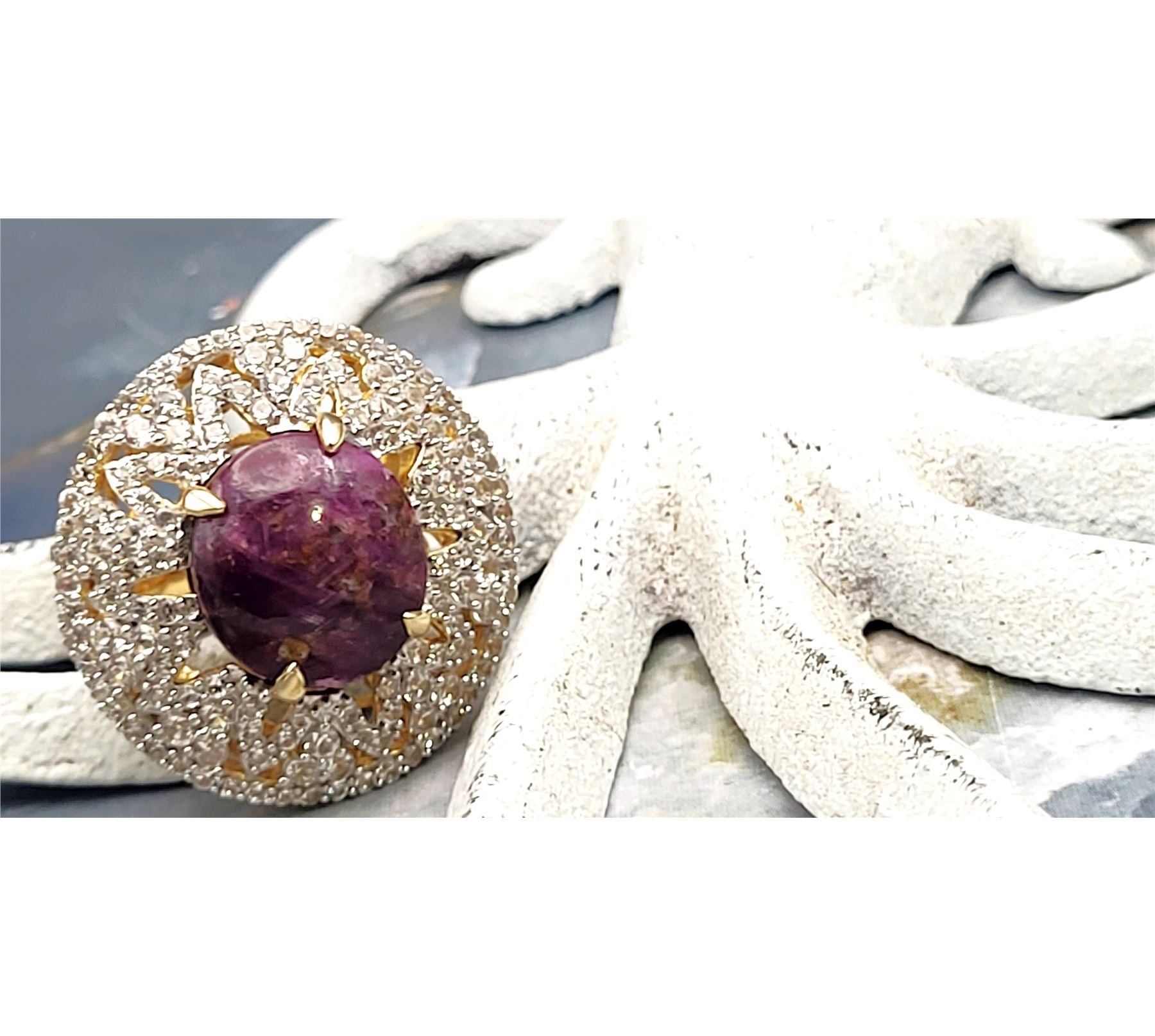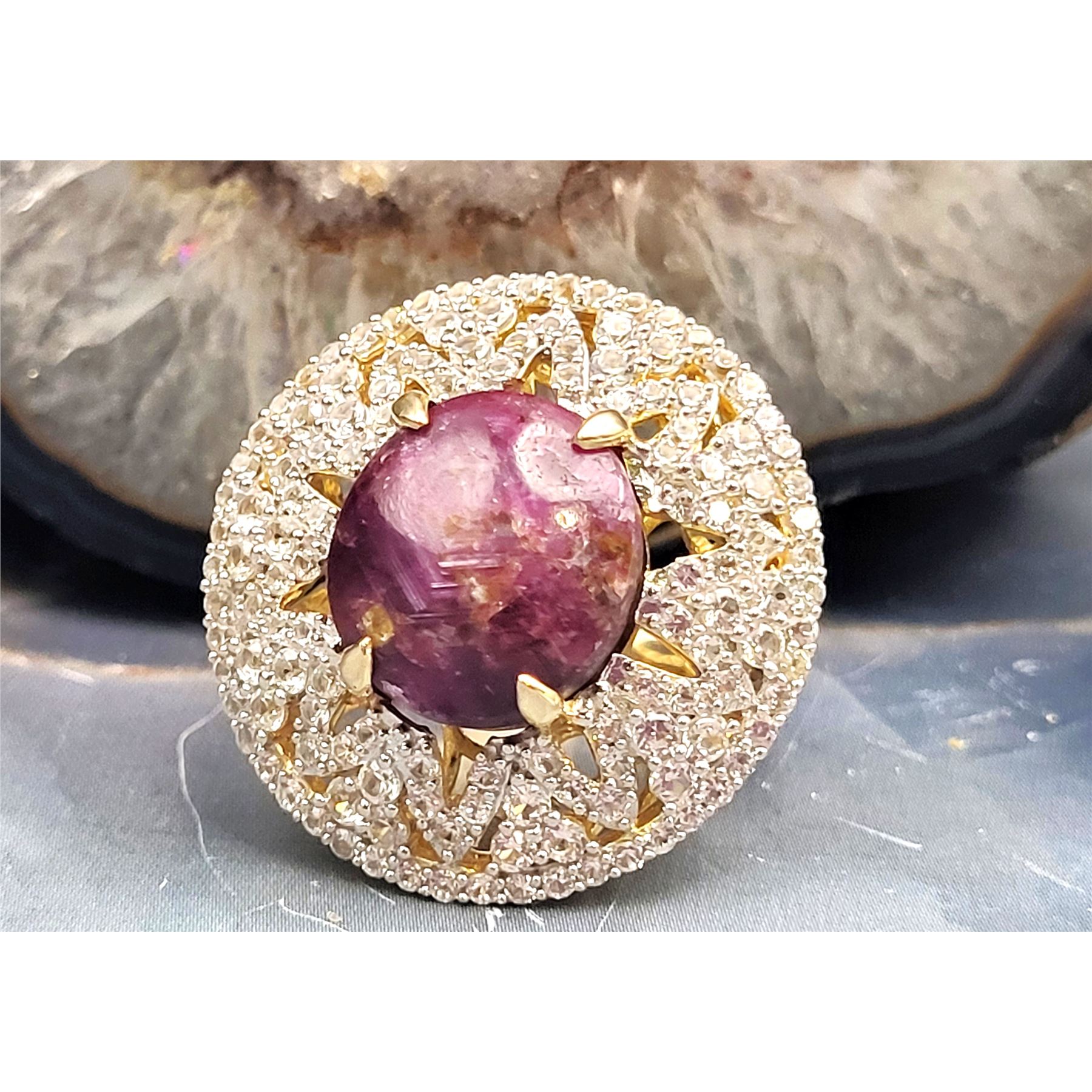 The contrast between the elegant, etoile-style, finely-set, genuine white sapphires and the deep, purplish-red, genuine natural star ruby that would still be considered rough ore, but for the low dome, oval-cut and enough of a polish to expose the faint, 5-ray star, creates a most dynamic statement ring.& nbsp; Pair it with the matching pendant in Lot 145 and the bold statement becomes & quot;Gasp-Worthy& quot;! It is cast in sterling silver with a 14 karat yellow gold overlay and features an approximate 21.00 carat round, cabochon-polished and claw prong set, genuine, certified natural, star ruby that is claw-set in an enormous & quot;skirt& quot;, aka triple halo, comprised of 3.90 carats of round, fully faceted, genuine white sapphires. The ring measures approximately 1 1/8& quot; wide at the top of the finger, and balance is assisted by the lovely lattice under gallery that supports the scrolling side gallery and gemstones.& nbsp; The split shoulders taper to a durable ring shank.& nbsp; The ring is US size 8.5.& nbsp; No sizing options are not offered on this ring, but a professional jeweler with the equipment necessary to work on vermeil in your area should be able to adjust the size. Admin: 7159/16-lhh