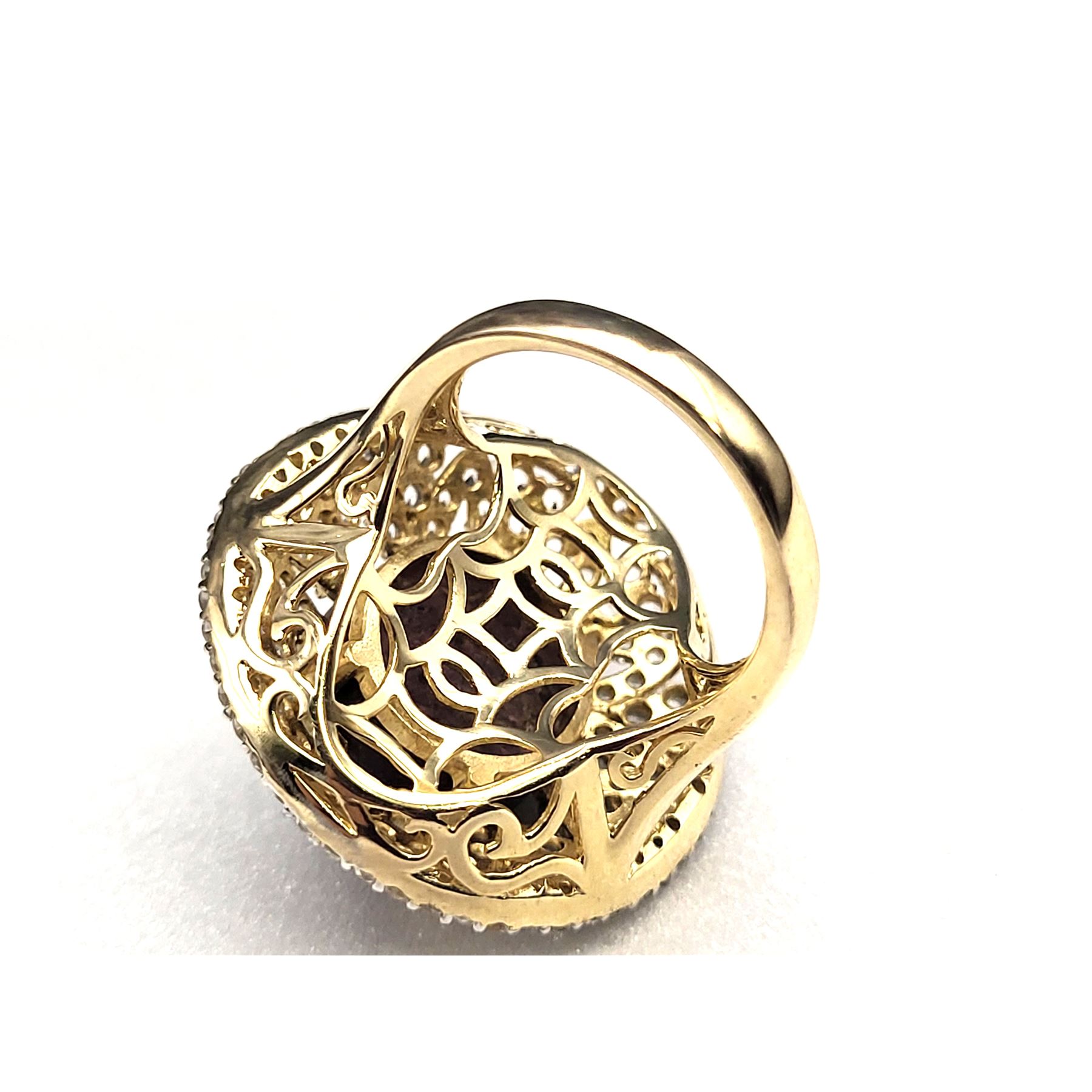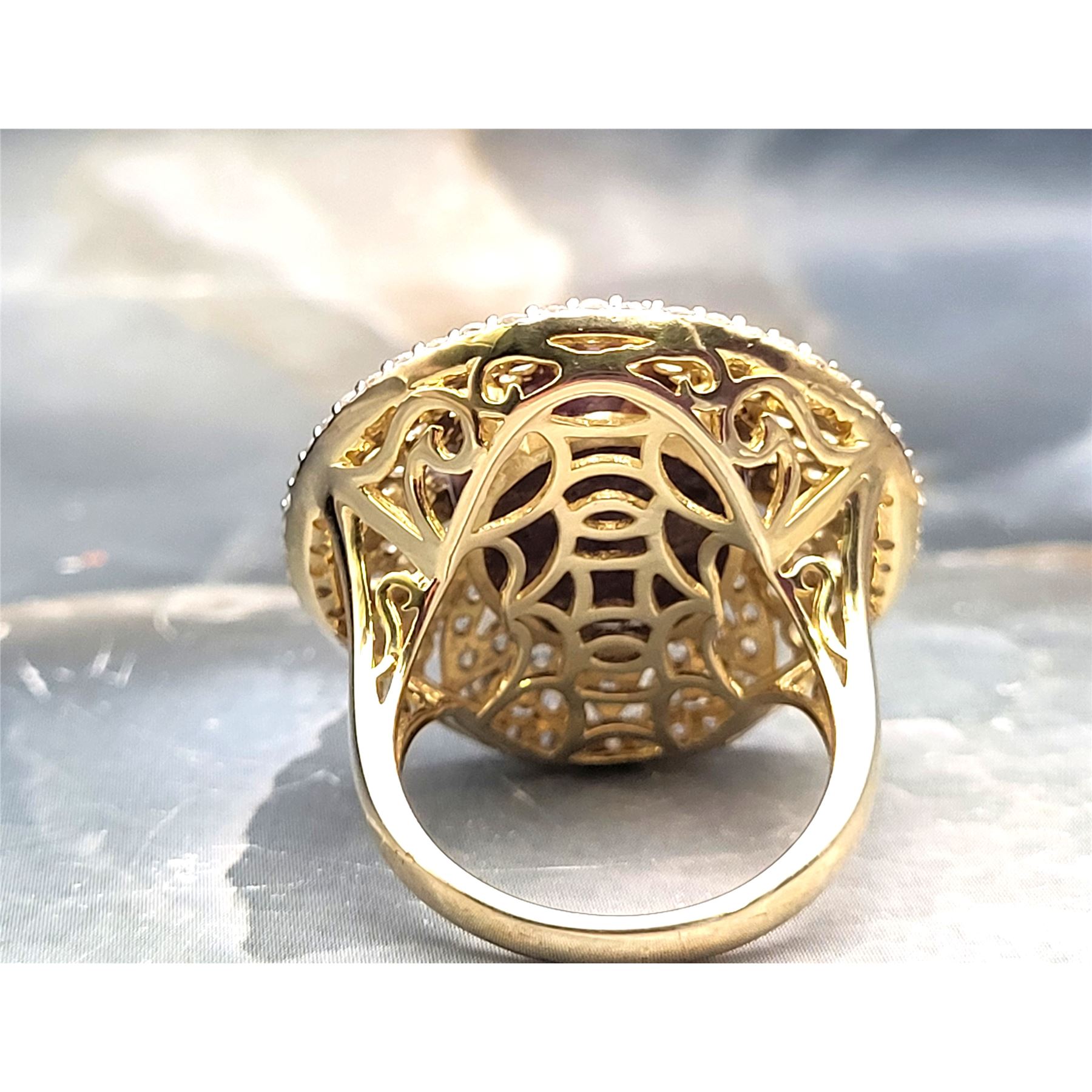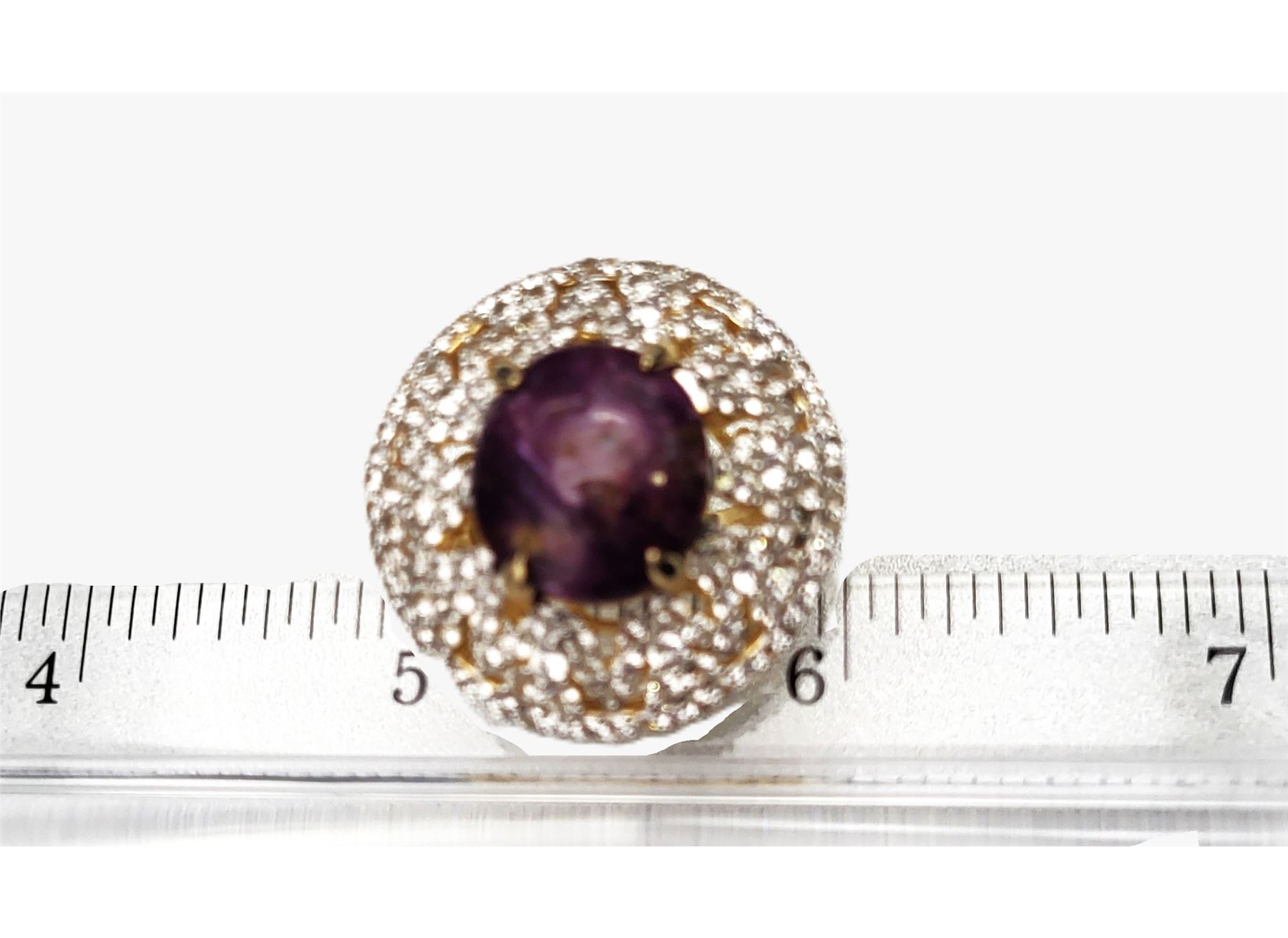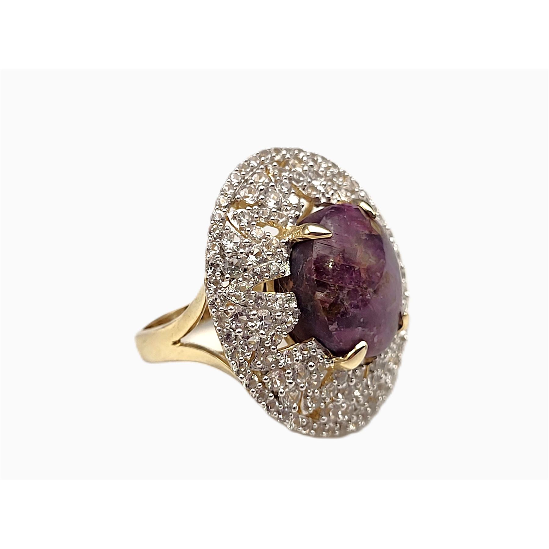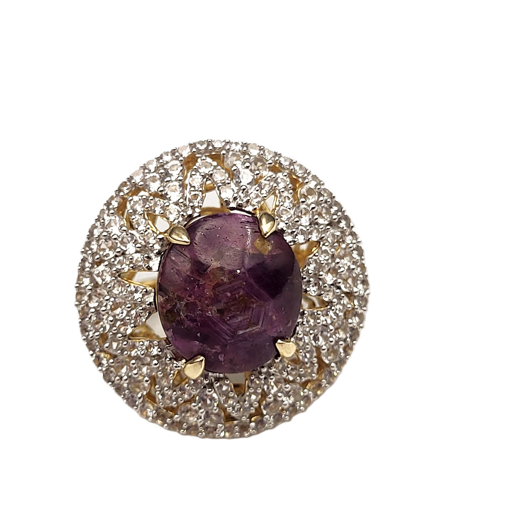 The contrast between the elegant, etoile-style, finely-set, genuine white sapphires and the deep, purplish-red, genuine natural star ruby that would still be considered rough ore, but for the low dome, oval-cut and enough of a polish to expose the faint, 5-ray star, creates a most dynamic statement ring.& nbsp; Pair it with the matching pendant in Lot 145 and the bold statement becomes & quot;Gasp-Worthy& quot;! It is cast in sterling silver with a 14 karat yellow gold overlay and features an approximate 21.00 carat round, cabochon-polished and claw prong set, genuine, certified natural, star ruby that is claw-set in an enormous & quot;skirt& quot;, aka triple halo, comprised of 3.90 carats of round, fully faceted, genuine white sapphires. The ring measures approximately 1 1/8& quot; wide at the top of the finger, and balance is assisted by the lovely lattice under gallery that supports the scrolling side gallery and gemstones.& nbsp; The split shoulders taper to a durable ring shank.& nbsp; The ring is US size 8.5.& nbsp; No sizing options are not offered on this ring, but a professional jeweler with the equipment necessary to work on vermeil in your area should be able to adjust the size. Admin: 7159/16-lhh