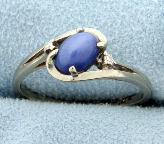 In 10K white gold, this ring contains a 7x5mm oval star sapphire with very distinctive astral points and two .01ct round diamonds. Size 6 3/4 2.0g