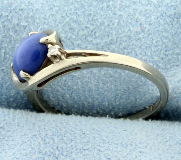 In 10K white gold, this ring contains a 7x5mm oval star sapphire with very distinctive astral points and two .01ct round diamonds. Size 6 3/4 2.0g
