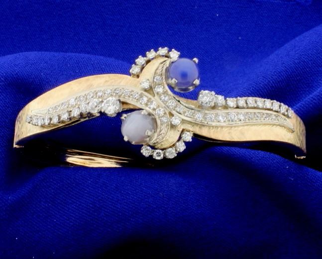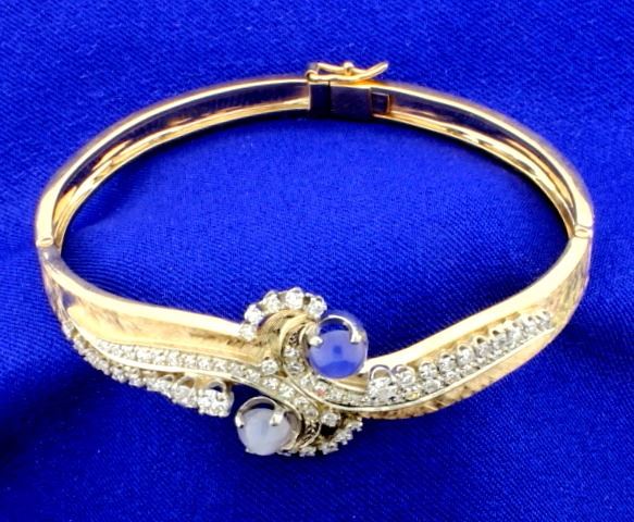 In 14k yellow gold this bracelet contains a 6mm blue and 6mm white star sapphire. Also contains 1.5cts TW of diamonds ranging from .02 to .1cts each. Diamonds are high quality SI clarity/G color. Bangle is 2 1/2 inches in diameter + has two hinges 29.8g