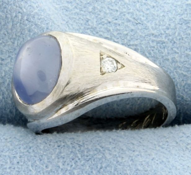 14K white gold, there is a 9mm oval star sapphire with a very visible "star" within the stone. There are two .05ct diamonds that are VS clarity, G color. Inscribed "RLF 1955" inside of shank. Size 5 3/4 7.3g