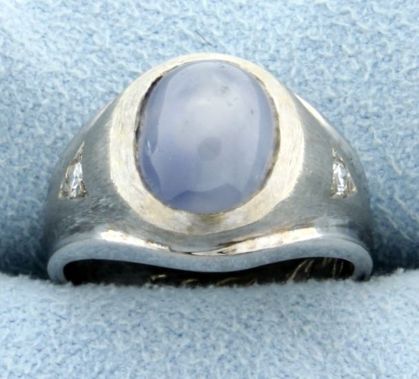 14K white gold, there is a 9mm oval star sapphire with a very visible "star" within the stone. There are two .05ct diamonds that are VS clarity, G color. Inscribed "RLF 1955" inside of shank. Size 5 3/4     7.3g
