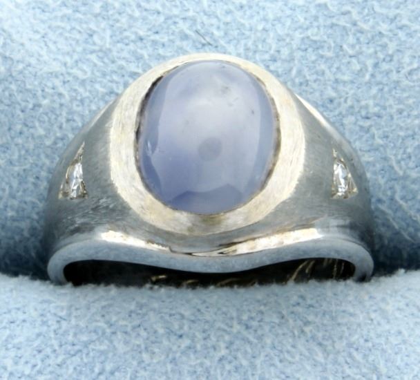 14K white gold, there is a 9mm oval star sapphire with a very visible "star" within the stone. There are two .05ct diamonds that are VS clarity, G color. Inscribed "RLF 1955" inside of shank. Size 5 3/4 7.3g