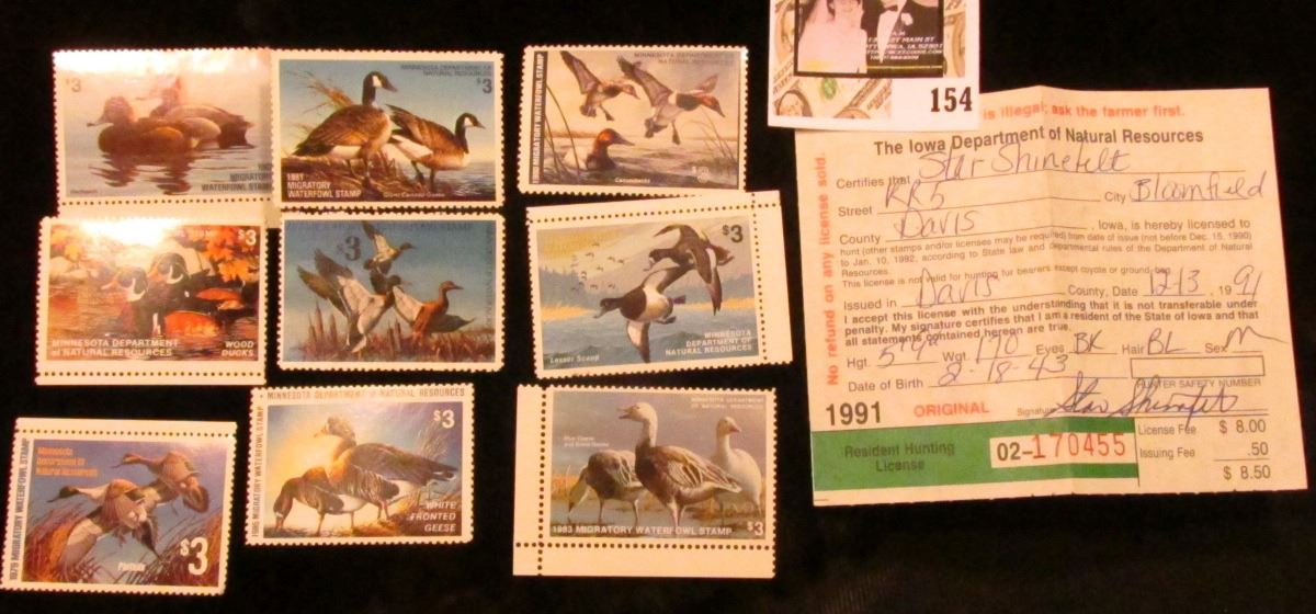 Star Shinefelt of Bloomfield's 1991 Resident Hunting License; 1977, 78, 79, 80, 81, 82, 84, & 85 Minnesota Migratory Waterfowl $3 Stamps depicting various Ducks, all mint, & unsigned.