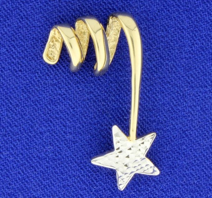 14K yellow and white gold, it is 1 1/4 inches long. Will fit up to 6mm omega or chain. 2.6g
