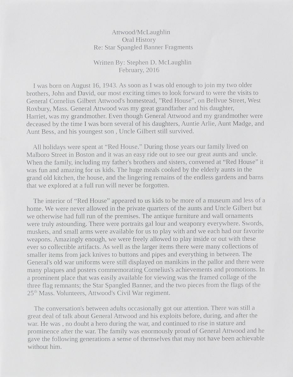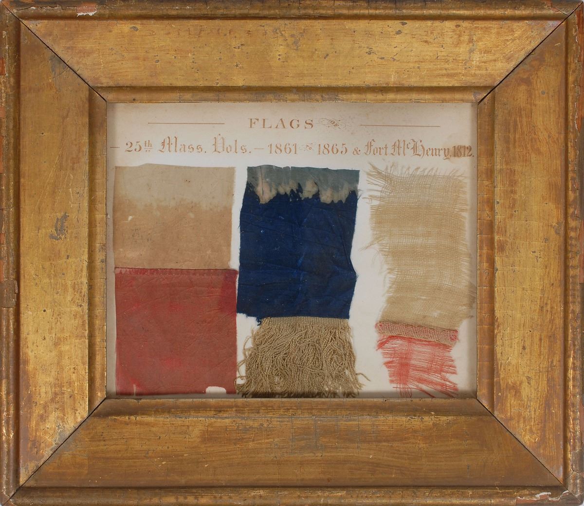 Accompanied by a letter of provenance from a descendant of General Attwood describing the history of the piece. In part: “General Attwood was my great grandfather and his daughter, Harriet, was my grandmother…All holidays were spent at ‘Red House’…The interior of ‘Red House’ appeared to us kids to be more of a museum and less of a home…Swords, muskets and small arms were available for us…The General’s old war uniforms were still displayed on mannequins in the parlor and there were many plaques and posters commemorating Cornelius’s achievements and promotions. In a prominent place that was easily available for viewing was the framed collage of the three flag remnants: the Star Spangled Banner, and the two pieces from the flags of the 25th Mass. Volunteers…After the passing of the Attwoods my mother, Esther, became the family historian and she continued to develop her interest in preserving family artifacts. I can recall that as a child I often overheard conversations about things of historical interest…It was in those early years that I first remember the name Commodore Preble being mentioned in respect to a relationship he had with General Attwood. Later when I was older mother mentioned the probability of Preble being the source of the Star Spangled Banner Fragment…Both these men were high ranking military notables and both were lecturers in the Boston area during the 1870s. There is no doubt that they knew each other. It was also spoken of that the Star Spangled Banner fragment was in actuality two separate fragments of the flag that were joined together when my uncle Gilbert (Cornelius Gilbert Attwood, Jr.) created the frame with the flag remnants.”