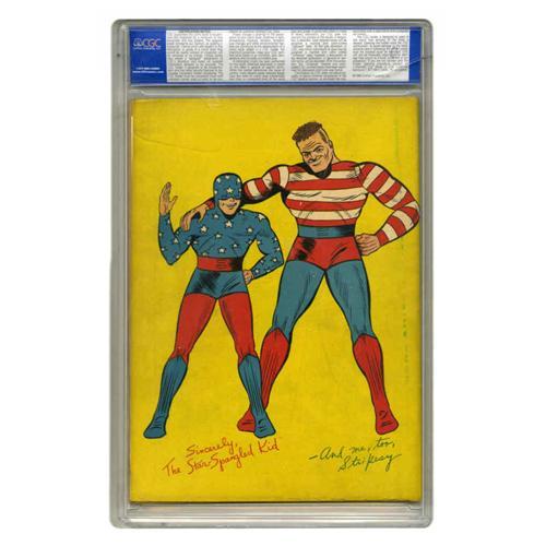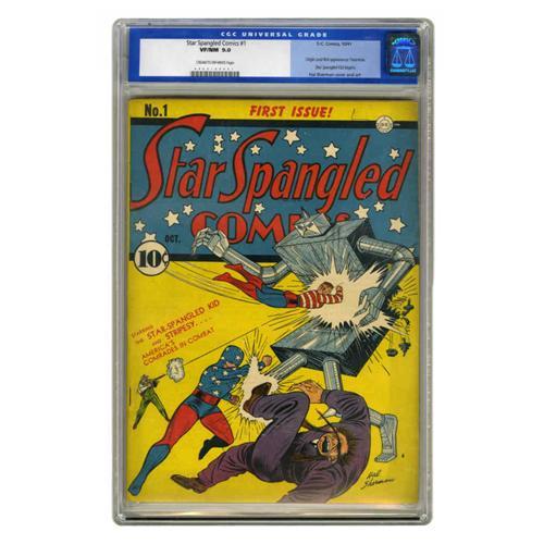 <B>Star Spangled Comics #1 (DC, 1941) CGC VF/NM 9.0 Cream to off-white pages.</B></I> He's a superhero who can walk up walls and shoot webs; yes, we're talking about the Tarantula, whose origin and first appearance are in this issue. The character, who had suction cups in his boots and carried a web-gun, was a regular in the early run of this title. The stars of the issue are the Star-Spangled Kid and his adult sidekick Stripesy; that's them on this robot cover by Hal Sherman. Note that the CGC slab has a two-inch crack at the top rear, not affecting the integrity of the holder or the comic itself. Overstreet 2005 VF/NM 9.0 value = $5,661; NM- 9.2 value = $7,800. CGC census 12/05: 1 in 9.0, 1 higher.