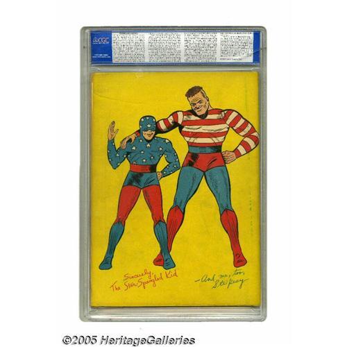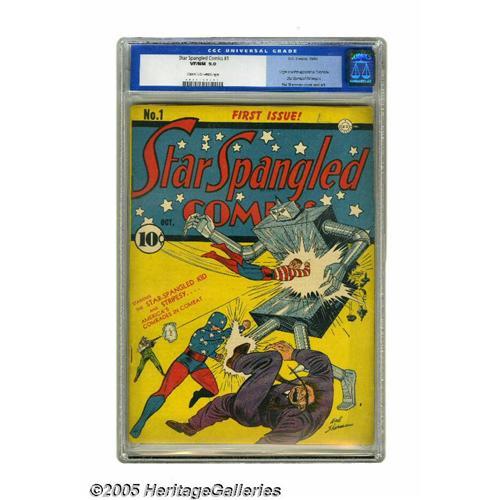 <B>Star Spangled Comics #1 (DC, 1941) CGC VF/NM 9.0 Cream to off-white pages.</B></I> He's a superhero who can walk up walls and shoot webs; yes, we're talking about the Tarantula, whose origin and first appearance are in this issue. The character, who had suction cups in his boots and carried a web-gun, was a regular in the early run of this title. The stars of the issue are the Star-Spangled Kid and his adult sidekick Stripesy; that's them on this robot cover by Hal Sherman. Note that the CGC slab has a two-inch crack at the top rear, not affecting the integrity of the holder or the comic itself. Overstreet 2005 VF/NM 9.0 value = $5,661; NM- 9.2 value = $7,800. CGC census 6/05: 1 in 9.0, 1 higher. <BR><BR><B>Important notice:</B> Heritage usually auctions material at the rate of 200-250 lots per hour. On some occasions eBay Live bid software or the Internet may not be able to keep up with the pace of the auction. We recommend placing a realistic absentee bid now as insurance to avoid disappointment. Occasionally the auctioneer may eliminate or reject an eBay Live bid, and the auctioneer may also reopen a lot after the close of the eBay live bidding (usually because we missed an audience bid), and may reject your bid even if it shows you as the winning bidder. By bidding via eBay Live, you agree that Heritage may award the lot to another bidder at its sole discretion under the circumstances described above or any other reasonable circumstances. Since eBay bids are not shown to us until we open the lot on the floor, we treat those bids just like floor bids. In most cases the floor responds before the eBay bid is presented to us, due to Internet lag time, so for consistency we have made it a policy that floor bids are always considered first over tie eBay live bids. Also please note that all Heritage lots purchased through eBay Live carry a 20% Buyer's Premium. Please make sure you read the Terms and Conditions before you bid. This lot is being auctioned in conjuncti