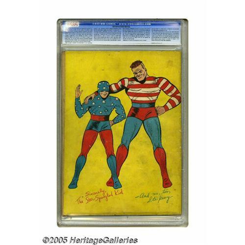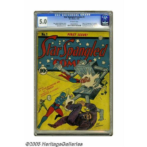 <B>Star Spangled Comics #1 (DC, 1941) CGC VG/FN 5.0 Off-white pages.</B></I> The Star-Spangled Kid and his adult sidekick Stripesy are the stars of this first issue; that's them on this robot cover by Hal Sherman. Also of note is the origin and first appearance of the Tarantula. Overstreet 2005 VG 4.0 value = $1,006; FN 6.0 value = $1,509. CGC census 9/05: 1 in 5.0, 9 higher. <BR><BR><B>Important notice:</B> Heritage usually auctions material at the rate of 200-250 lots per hour. On some occasions eBay Live bid software or the Internet may not be able to keep up with the pace of the auction. We recommend placing a realistic absentee bid now as insurance to avoid disappointment. Occasionally the auctioneer may eliminate or reject an eBay Live bid, and the auctioneer may also reopen a lot after the close of the eBay live bidding (usually because we missed an audience bid), and may reject your bid even if it shows you as the winning bidder. By bidding via eBay Live, you agree that Heritage may award the lot to another bidder at its sole discretion under the circumstances described above or any other reasonable circumstances. Since eBay bids are not shown to us until we open the lot on the floor, we treat those bids just like floor bids. In most cases the floor responds before the eBay bid is presented to us, due to Internet lag time, so for consistency we have made it a policy that floor bids are always considered first over tie eBay live bids. Also please note that all Heritage lots purchased through eBay Live carry a 20% Buyer's Premium. Please make sure you read the Terms and Conditions before you bid. This lot is being auctioned in conjunction with a live floor auction by Heritage Galleries & Auctioneers. All final auction and invoice information will be supplied by Heritage Galleries & Auctioneers, and all other information should be considered preliminary. Lot:2187 <BR><BR><B>Winning Notification and Billing:</B> After the FINAL session in this auction is complet