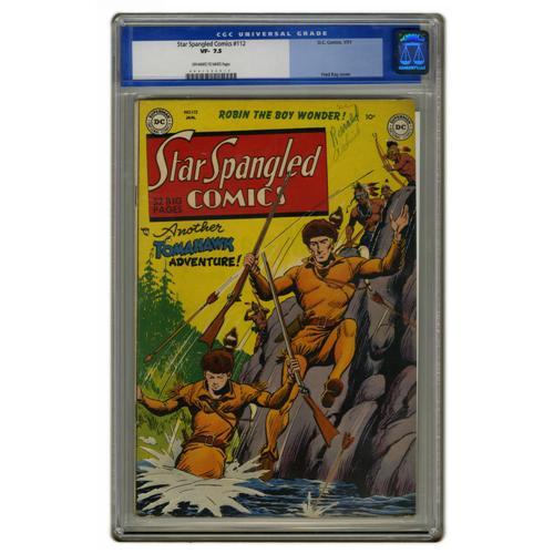 <B>Star Spangled Comics #112 (DC, 1951) CGC VF- 7.5 Off-white to white pages.</B></I> Batman guest-stars in the Robin story. Fred Ray cover featuring Tomahawk. Overstreet 2006 VF 8.0 value = $210. CGC census 3/06: 1 in 7.5, 3 higher.
