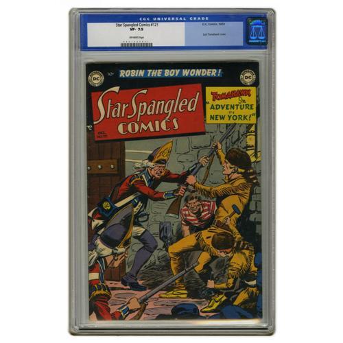 <B>Star Spangled Comics #121 (DC, 1951) CGC VF- 7.5 Off-white pages.</B></I> Tomahawk cover by Fred Ray. Robin the Boy Wonder and Captain Compass also appear. Overstreet 2006 VF 8.0 value = $192. CGC census 3/06: 1 in 7.5, 1 higher.