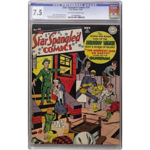 <B>Star Spangled Comics #14 (DC, 1942) CGC VF- 7.5 Off-white to white pages.</B></I> The Newsboy Legion is a "foist-rate" outfit, and comics' greatest art duo Simon and Kirby drew them in this issue! Other features include the Star Spangled Kid, the Tarantula, TNT and Dan the Dyna-Mite, and Robotman. Overstreet 2007 VF 8.0 value = $756. CGC census 6/07: 1 in 7.5, 2 higher.<BR><BR><b>Shipping:</b> Comics - Slabbed (certified) (<a target="_blank" href="http://www.heritageauctions.com/common/shipping.php">view shipping information</a>)