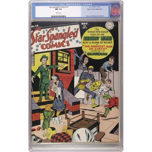 <B>Star Spangled Comics #14 Mile High pedigree (DC, 1942) CGC NM 9.4 White pages.</B></I> Simon and Kirby's Newsboy Legion and their superhero pal the Guardian starred in this star-spangled mag. S & K also drew the corresponding story inside the book. Other features include the Star Spangled Kid, the Tarantula, TNT and Dan the Dyna-Mite, and Robotman. This stunning pedigreed book is the highest graded copy certified by CGC to date. Overstreet 2006 NM- 9.2 value = $1,675. CGC census 10/06: 1 in 9.4, none higher.<BR><BR><b>Shipping:</b> Slabbed Comic (<a target="_blank" href="http://www.heritageauctions.com/common/shipping.php">view shipping information</a>)