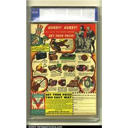 Star Spangled Comics #18 (DC, 1943) CGC VF/NM 9.0 Cream to off-white pages. This is an absolutely gorgeous copy of what is clearly a Simon and Kirby cover. Inside you will find the origin of the Star-Spangled Kid, which is cool enough, but it's the fresh colors of the cover that make this a gem. Be stealthy and slip in a bid on this one. Overstreet 2002 NM 9.4 value = $1,750. Important notice: We expect to be auctioning lots at the rate of 200-250 per hour. Sometimes eBay Premier live bid software cannot keep up with that pace, so we strongly recommend that you place a realistic proxy bid now as insurance to avoid disappointment. Also please note that all Heritage/CAA lots purchased through eBay Premier carry a 20% Buyer's Premium.