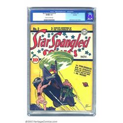 Star Spangled Comics #2 Rockford pedigree (DC, 1941) CGC VF/NM 9.0 Cream to off-white pages. Hal Sherman's cover has the Star Spangled Kid and Stripesy battling evildoers in the stratosphere. Today, the stratosphere! Tomorrow, the ionosphere! Someday, they will remember their space suits! This is currently the nicest specimen of an issue #2 to be certified by CGC. Overstreet 2002 NM 9.4 value = $1,850. Important notice: We expect to be auctioning lots at the rate of 200-250 per hour. Sometimes eBay Premier live bid software cannot keep up with that pace, so we strongly recommend that you place a realistic proxy bid now as insurance to avoid disappointment. Also please note that all Heritage/CAA lots purchased through eBay Premier carry a 20% Buyer's Premium. Please make sure you read the Terms and Conditions.