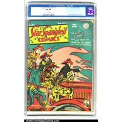 Star Spangled Comics #27 (DC, 1943). An attractive copy of this showcase title with a great Simon and Kirby cover and a Jimmy Thompson Robotman story. There is a small piece out at the top right corner, otherwise this book looks nicer than the grade would indicate. CGC Fine+ 6.5 Off-white pages. Overstreet FN 6.0 value = $308. Important notice: We expect to be auctioning lots at the rate of 200-250 per hour. Sometimes eBay Premier live bid software cannot keep up with that pace, so we strongly recommend that you place a realistic proxy bid now as insurance to avoid disappointment. Also please note that all Heritage/CAA lots purchased through eBay Premier carry a 20% Buyer's Premium.