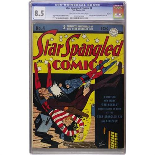 <B>Star Spangled Comics #4 Rockford pedigree (DC, 1942) CGC VF+ 8.5 Light tan to off-white pages.</B></I> One of the nicest copies of this early issue in existence. Full page ad for <B>Sensation Comics </B></I>#1. Hal Sherman cover and art. Overstreet 2007 VF 8.0 value = $650; VF/NM 9.0 value = $1,050. CGC census 6/07: 2 in 8.5, 2 higher.<BR><BR><b>Shipping:</b> Comics - Slabbed (certified) (<a target="_blank" href="http://www.heritageauctions.com/common/shipping.php">view shipping information</a>)