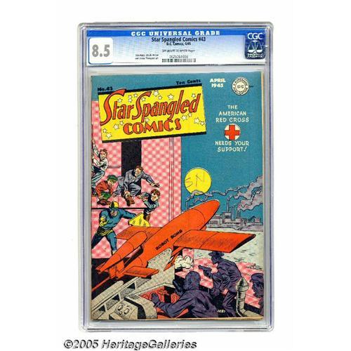 <B>Star Spangled Comics #43 (DC, 1945) CGC VF+ 8.5 Off-white to white pages.</B></I> Art by Stan Kaye, Chuck Winter, and Jimmy Thompson. Overstreet 2005 VF 8.0 value = $323; VF/NM 9.0 value = $494. CGC census 9/05: 1 in 8.5, 1 higher. <BR><BR><B>Important notice:</B> Heritage usually auctions material at the rate of 200-250 lots per hour. On some occasions eBay Live bid software or the Internet may not be able to keep up with the pace of the auction. We recommend placing a realistic absentee bid now as insurance to avoid disappointment. Occasionally the auctioneer may eliminate or reject an eBay Live bid, and the auctioneer may also reopen a lot after the close of the eBay live bidding (usually because we missed an audience bid), and may reject your bid even if it shows you as the winning bidder. By bidding via eBay Live, you agree that Heritage may award the lot to another bidder at its sole discretion under the circumstances described above or any other reasonable circumstances. Since eBay bids are not shown to us until we open the lot on the floor, we treat those bids just like floor bids. In most cases the floor responds before the eBay bid is presented to us, due to Internet lag time, so for consistency we have made it a policy that floor bids are always considered first over tie eBay live bids. Also please note that all Heritage lots purchased through eBay Live carry a 20% Buyer's Premium. Please make sure you read the Terms and Conditions before you bid. This lot is being auctioned in conjunction with a live floor auction by Heritage Galleries & Auctioneers. All final auction and invoice information will be supplied by Heritage Galleries & Auctioneers, and all other information should be considered preliminary. Lot:2203 <BR><BR><B>Winning Notification and Billing:</B> After the FINAL session in this auction is complete, Heritage will send e-mail and snail mail invoices. This process normally takes several days. All final auction and invoice information will b