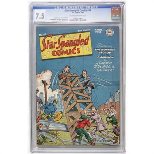 <B>Star Spangled Comics #55 (DC, 1946) CGC VF- 7.5 Cream to off-white pages.</B></I> Nice copy of an issue that we've seen infrequently over the years. The cover's by a youthful Curt Swan, who was still a decade away from establishing himself as the pre-eminent interpreter of Superman. Overstreet 2007 VF 8.0 value = $293. CGC census 1/08: 1 in 7.5, 5 higher. <I>From the Fantastic Frank Collection.</B></I><BR><BR><b>Shipping:</b> Comics - Slabbed (certified) (<a target="_blank" href="http://www.heritageauctions.com/common/shipping.php">view shipping information</a>)