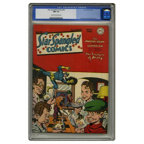 <B>Star Spangled Comics #56 (DC, 1946) CGC NM 9.4 Cream to off-white pages.</B></I> The Newsboy Legion find their oyster dinner decorated with pearls on this cute cover by Joe Simon and Jack Kirby. The boys would soon be vacating their spot in this title to make way for a certain Boy Wonder, whose solo stories begin in issue #65. This copy is a pearl in itself; it's very fresh and attractive. Overstreet 2006 NM- 9.2 value = $625. CGC census 03/06: 1 in 9.4, none higher.