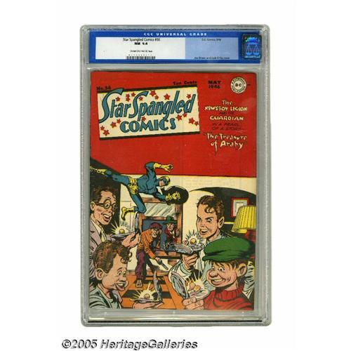 <B>Star Spangled Comics #56 (DC, 1946) CGC NM 9.4 Cream to off-white pages.</B></I> The Newsboy Legion find their oyster dinner decorated with pearls on this cute cover by Joe Simon and Jack Kirby. The boys would soon be vacating their spot in this title to make way for a certain Boy Wonder, whose solo stories begin in issue #65. This copy is a pearl in itself; it's very fresh and attractive. Overstreet 2005 NM- 9.2 value = $600. CGC census 7/05: 1 in 9.4, none higher. <BR><BR><B>Important notice:</B> Heritage usually auctions material at the rate of 200-250 lots per hour. On some occasions eBay Live bid software or the Internet may not be able to keep up with the pace of the auction. We recommend placing a realistic absentee bid now as insurance to avoid disappointment. Occasionally the auctioneer may eliminate or reject an eBay Live bid, and the auctioneer may also reopen a lot after the close of the eBay live bidding (usually because we missed an audience bid), and may reject your bid even if it shows you as the winning bidder. By bidding via eBay Live, you agree that Heritage may award the lot to another bidder at its sole discretion under the circumstances described above or any other reasonable circumstances. Since eBay bids are not shown to us until we open the lot on the floor, we treat those bids just like floor bids. In most cases the floor responds before the eBay bid is presented to us, due to Internet lag time, so for consistency we have made it a policy that floor bids are always considered first over tie eBay live bids. Also please note that all Heritage lots purchased through eBay Live carry a 20% Buyer's Premium. Please make sure you read the Terms and Conditions before you bid. This lot is being auctioned in conjunction with a live floor auction by Heritage Galleries & Auctioneers. All final auction and invoice information will be supplied by Heritage Galleries & Auctioneers, and all other information should be considered preliminary. Lot:2209 <BR>
