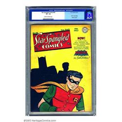 Star Spangled Comics #65 (DC, 1947) CGC VF- 7.5 Cream to off-white pages. Here is a key book that does not seem to surface very often and this is the first copy that we, at Heritage, have offered at auction. Robin begins his long run of appearances on the cover with this issue and Batman makes a cameo appearance in one panel, as well. This high-grade book looks even nicer than the assigned grade. Overstreet 2002 VF 8.0 value = $938. Important notice: We expect to be auctioning lots at the rate of 200-250 per hour. Sometimes eBay Premier live bid software cannot keep up with that pace, so we strongly recommend that you place a realistic proxy bid now as insurance to avoid disappointment. Also please note that all Heritage/CAA lots purchased through eBay Premier carry a 20% Buyer's Premium. Please make sure you read the Terms and Conditions.