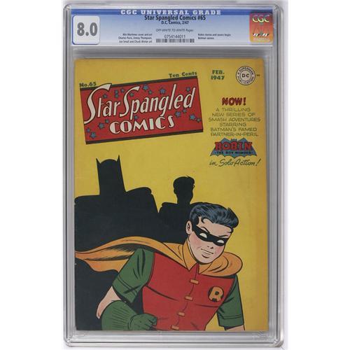 <B>Star Spangled Comics #65 (DC, 1947) CGC VF 8.0 Off-white to white pages.</B></I> This is the nicest copy of this issue we've seen in a while, and it's not readily apparent what flaws kept it from a higher grade. The issue has the first of the series of Robin solo stories, with Batman putting in a one-panel cameo. The cover art is by Win Mortimer. Overstreet 2006 VF 8.0 value = $925. CGC census 3/06: 1 in 8.0, 1 higher. <I>From the Collection of Harold Curtis.</B></I>