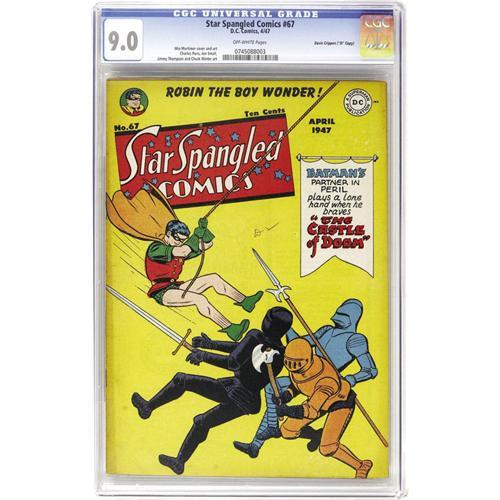 <B>Star Spangled Comics #67 Davis Crippen ("D" Copy) pedigree (DC, 1947) CGC VF/NM 9.0 Off-white pages.</B></I> Only the Mile High copy has been graded higher than this one to date! Robin the Boy Wonder is the star of the show, and he's drawn by Win Mortimer both on the cover and inside the issue. Overstreet 2006 VF/NM 9.0 value = $660; NM- 9.2 value = $. CGC census 7/06: 1 in 9.0, 1 higher. <I>From the Crippen Collection.</B></I> <BR><BR><B>Important notice:</B> Heritage usually auctions material at the rate of 200-250 lots per hour. On some occasions eBay Live bid software or the Internet may not be able to keep up with the pace of the auction. We recommend placing a realistic absentee bid now as insurance to avoid disappointment. Occasionally the auctioneer may eliminate or reject an eBay Live bid, and the auctioneer may also reopen a lot after the close of the eBay live bidding (usually because we missed an audience bid), and may reject your bid even if it shows you as the winning bidder. By bidding via eBay Live, you agree that Heritage may award the lot to another bidder at its sole discretion under the circumstances described above or any other reasonable circumstances. Since eBay bids are not shown to us until we open the lot on the floor, we treat those bids just like floor bids. In most cases the floor responds before the eBay bid is presented to us, due to Internet lag time, so for consistency we have made it a policy that floor bids are always considered first over tie eBay live bids. Also please note that all Heritage lots purchased through eBay Live carry a 22.5% Buyer's Premium. Please make sure you read the Terms and Conditions before you bid. This lot is being auctioned in conjunction with a live floor auction by Heritage Auction Galleries. All final auction and invoice information will be supplied by Heritage Auction Galleries, and all other information should be considered preliminary. Lot:41001 <BR><BR><B>Winning Notification and Billing:</B> After the FINAL session in this auction is complete, Heritage will send e-mail and snail mail invoices. This process normally takes several days. All final auction and invoice information will be supplied by Heritage Auction Galleries, and all other information should be considered preliminary. <BR><BR>This auction will be conducted on a live auction floor and over the Internet through eBay Live. If you choose to place an absentee bid, please take a moment to <font color='#0000ff'><u><a href='http://pages.ebay.com/liveauctions/help/before/laabsentee.html'>learn how eBay Live absentee bidding works</a></u></font><font color='#000000'>
