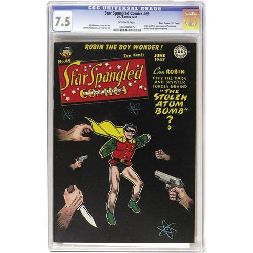 <B>Star Spangled Comics #69 Davis Crippen ("D" Copy) pedigree (DC, 1947) CGC VF- 7.5 Off-white pages.</B></I> This is key stuff for any 1950s DC fan, it's the first appearance of Tomahawk! The white man who grew up among the Indians was a regular in this series and in <B>World's Finest</B></I> in the years to come, and of course he starred in his own title for many years. Also of note are some atom bomb explosion panels (alluded to on the cover, which features Robin and was drawn by Win Mortimer). Other characters on hand include Robotman and the Star Spangled Kid. This copy's unblemished black cover looks fantastic! Overstreet 2006 VF 8.0 value = $694. CGC census 7/06: 1 in 7.5, 2 higher. <I>From the Crippen Collection.</B></I> <BR><BR><B>Important notice:</B> Heritage usually auctions material at the rate of 200-250 lots per hour. On some occasions eBay Live bid software or the Internet may not be able to keep up with the pace of the auction. We recommend placing a realistic absentee bid now as insurance to avoid disappointment. Occasionally the auctioneer may eliminate or reject an eBay Live bid, and the auctioneer may also reopen a lot after the close of the eBay live bidding (usually because we missed an audience bid), and may reject your bid even if it shows you as the winning bidder. By bidding via eBay Live, you agree that Heritage may award the lot to another bidder at its sole discretion under the circumstances described above or any other reasonable circumstances. Since eBay bids are not shown to us until we open the lot on the floor, we treat those bids just like floor bids. In most cases the floor responds before the eBay bid is presented to us, due to Internet lag time, so for consistency we have made it a policy that floor bids are always considered first over tie eBay live bids. Also please note that all Heritage lots purchased through eBay Live carry a 22.5% Buyer's Premium. Please make sure you read the Terms and Conditions before you bid. This lot is being auctioned in conjunction with a live floor auction by Heritage Auction Galleries. All final auction and invoice information will be supplied by Heritage Auction Galleries, and all other information should be considered preliminary. Lot:41001 <BR><BR><B>Winning Notification and Billing:</B> After the FINAL session in this auction is complete, Heritage will send e-mail and snail mail invoices. This process normally takes several days. All final auction and invoice information will be supplied by Heritage Auction Galleries, and all other information should be considered preliminary. <BR><BR>This auction will be conducted on a live auction floor and over the Internet through eBay Live. If you choose to place an absentee bid, please take a moment to <font color='#0000ff'><u><a href='http://pages.ebay.com/liveauctions/help/before/laabsentee.html'>learn how eBay Live absentee bidding works</a></u></font><font color='#000000'>