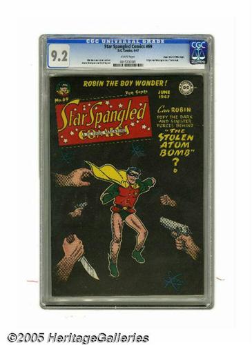 <B>Star Spangled Comics #69 Mile High pedigree (DC, 1947) CGC NM- 9.2 White pages.</B></I> This issue has the first appearance of the long-running character Tomahawk. The white man who grew up among the Indians was a regular in this series and in <B>World's Finest</B></I> in the years to come, and even starred in his own title from 1950 to 1972. Other assets of the issue include a story with an atom bomb theme starring Robin (and mentioned on the cover, which is by Win Mortimer). Other characters on hand include Robotman and the Star Spangled Kid. Overstreet 2005 NM- 9.2 value = $1,350. CGC census 2/05: 1 in 9.2, none higher.