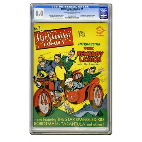 <B>Star Spangled Comics #7 (DC, 1942) CGC VF 8.0 Off-white pages.</B></I> Joe Simon and Jack Kirby introduced their memorable Newsboy Legion feature in this issue with an origin story of the Guardian. Also included are the Star Spangled Kid, Robotman (who also debuts this issue, complete with origin), and the Tarantula. CGC notes, "Moderate tanning interior front and back cover." Also note that the CGC holder is cracked along the right edge, which does not harm the book inside. Overstreet 2005 VF 8.0 value = $1,878. CGC census 11/05: 2 in 8.0, 2 higher.