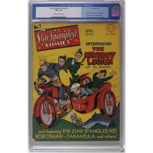 <B>Star Spangled Comics #7 (DC, 1942) CGC VF+ 8.5 Off-white to white pages.</B></I> Any Simon and Kirby lover will want to pick this one up, it's the first appearance of the Newsboy Legion! And the story also has the origin and first appearance of the Guardian, who the newsboys always <I>suspected</B></I> was really Officer Jim Harper (we readers knew for sure). A couple of other new features debuted here as well, namely Robotman (not the guy from Doom Patrol, but the Jerry Siegel creation who later joined the All-Star Squadron) and TNT (plus the latter's sidekick Dan the Dyna-Mite). Overstreet 2006 VF 8.0 value = $4,452; VF/NM 9.0 value = $7,476. CGC census 03/06: 1 in 8.5, 1 higher.