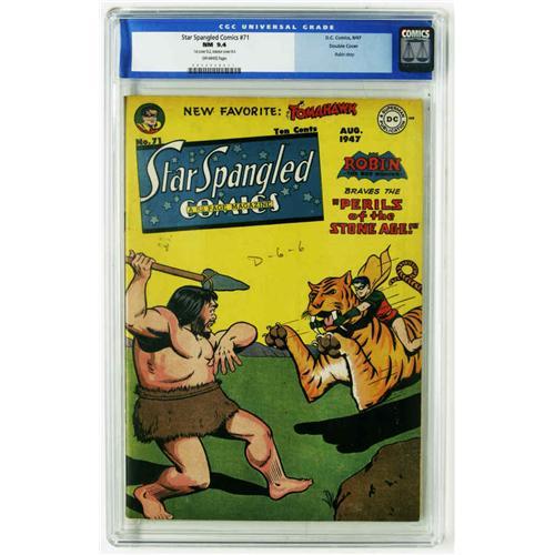 <B>Star Spangled Comics #71 Double Cover (DC, 1947) CGC NM 9.4 Off-white pages.</B></I> Robin goes primitive in this issue's cover story, "Perils of the Stone Age." Tomahawk makes his third appearance. CGC notes, "1st cover 9.2, interior cover 9.4." Overstreet 2005 NM- 9.2 value = $875. CGC census 11/05: 1 in 9.4, none higher.