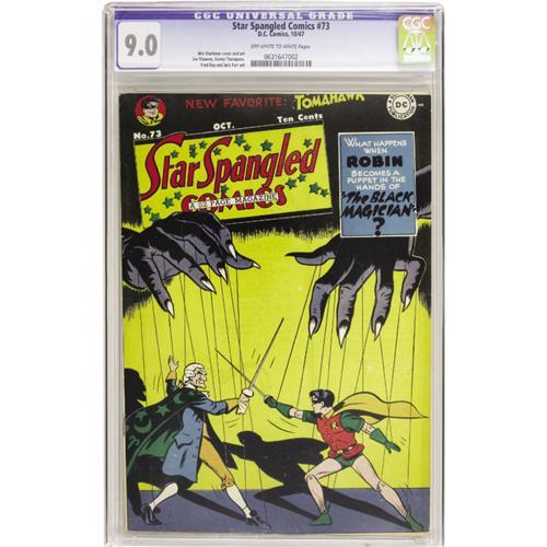<B>Star Spangled Comics #73 (DC, 1947) CGC VF/NM 9.0 Off-white to white pages.</B></I> The Robin issues of this title are some of the more difficult to find in high grade in the entire run. The cover is by Win Mortimer, who also provided story art along with Jim Mooney and Fred Ray. Overstreet 2006 VF/NM 9.0 value = $660; NM- 9.2 value = $900. CGC census 12/06: 2 in 9.0, 1 higher.<BR><BR><b>Shipping:</b> Slabbed Comic (<a target="_blank" href="http://www.heritageauctions.com/common/shipping.php">view shipping information</a>)
