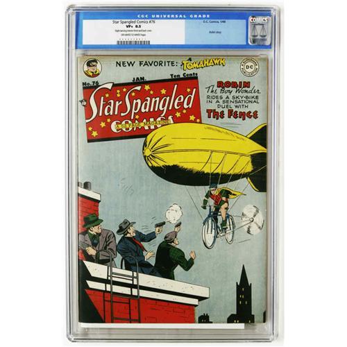 <B>Star Spangled Comics #76 (DC, 1948) CGC VF+ 8.5 Off-white to white pages.</B></I> Another high-flying Robin solo tale is cover-featured this issue. Artists include Win Mortimer and Fred Ray. This attractive copy bears the note from CGC, "Slight tanning interior front and back cover." Overstreet 2005 VF 8.0 value = $419; VF/NM 9.0 value = $647. CGC census 11/05: 2 in 8.5, none higher.