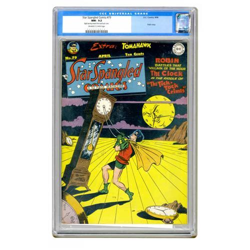<B>Star Spangled Comics #79 (DC, 1948) CGC NM- 9.2 Off-white to white pages.</B></I> Check out the highest-graded copy yet certified of this issue. By the way, didja know Salvador Dali often ghosted for Bob Kane? We're just teasing, but we like the way Jim Mooney paid homage to Dali's "Persistence of Memory" on this issue's cover. Mooney also drew the lead story featuring Robin the Boy Wonder. Backup features include the Star Spangled Kid and Fred Ray's Tomahawk. CGC notes, "Slight tanning (on) interior front and back cover." Overstreet 2005 NM- 9.2 value = $875. CGC census 11/05: 1 in 9.2, none higher.