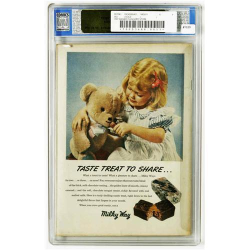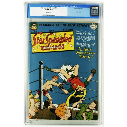 <B>Star Spangled Comics #82 (DC, 1948) CGC VF/NM 9.0 Off-white pages.</B></I> Robin gets knocked for a loop on this boxing ring cover, but not to worry -- hey, he's a tough bird! Inside, Robotman appears in his last solo story. A very attractive copy, featuring a smooth spine. Overstreet 2005 VF/NM 9.0 value = $484; NM- 9.2 value = $650. CGC census 11/05: 2 in 9.0, none higher.