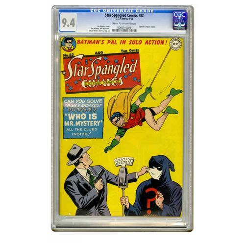 <B>Star Spangled Comics #83 (DC, 1948) CGC NM 9.4 Cream to off-white pages.</B></I> It's the first appearance of Captain Compass (real name: Mark Compass), a detective hired by a steamship company to thwart crimes on the high seas! He'd be a regular for the remainder of this series. Meanwhile, the Tomahawk feature, drawn by Fred Ray, has the hero discovering a lost valley where dinosaurs live -- very Turok-esque! The star of the comic is of course Robin the Boy Wonder, and the Star Spangled Kid rounds out the lineup. This is the only copy of the issue graded above 8.0 by CGC to date. Overstreet 2005 NM- 9.2 value = $650. CGC census 11/05: 1 in 9.4, none higher.