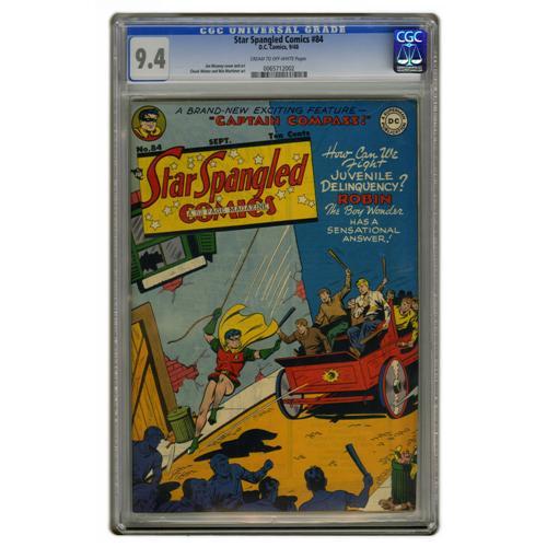 <B>Star Spangled Comics #84 (DC, 1948) CGC NM 9.4 Cream to off-white pages.</B></I> Overstreet calls this issue "rare." Robin the Boy Wonder, Tomahawk, and Captain Compass are the key features. The cover is by Jim Mooney. Overstreet 2006 NM- 9.2 value = $1,050. CGC census 3/06: 1 in 9.4, none higher.