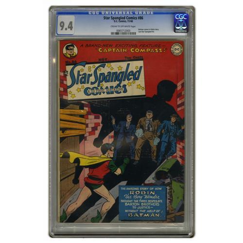 <B>Star Spangled Comics #86 (DC, 1948) CGC NM 9.4 Cream to off-white pages.</B></I> While the lead feature's a Robin <I>solo</B></I> story, Batman does put in a cameo in this issue, in a story drawn by Jim Mooney. One hero who doesn't appear at all is the Star Spangled Kid -- while the feature named for him has its final installment here, it's a solo adventure of his sister Merry, the Girl of 1,000 Gimmicks. Tomahawk and Captain Compass round out the lineup. This is the only copy of the issue graded above 6.5 by CGC as of this writing. Overstreet 2006 NM- 9.2 value = $785. CGC census 3/06: 1 in 9.4, none higher.