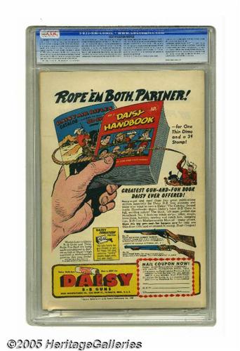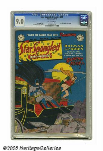 <B>Star Spangled Comics #90 (DC, 1949) CGC VF/NM 9.0 Off-white pages.</B></I> While this title featured Robin in "solo" adventures, Batman did put in a guest appearance on many occasions. The issue's Western-themed Dynamic Duo cover is by Win Mortimer. The issue's Robin story has Mortimer art, and there's also a story with a real Western hero, Tomahawk. It's drawn by Fred Ray. Overstreet 2005 VF/NM 9.0 value = $575; NM- 9.2 value = $775. CGC census 1/05: 1 in 9.0, none higher.