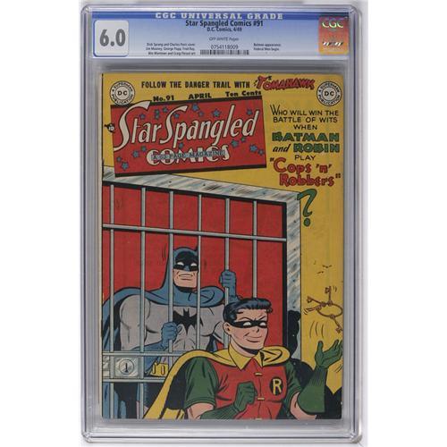 <B>Star Spangled Comics #91 (DC, 1949) CGC FN 6.0 Off-white pages.</B></I> Robin, Tomahawk, Captain Compass, and Federal Agent are featured. Batman guest-stars in the Robin story. Dick Sprang and Charles Paris cover. Overstreet 2006 FN 6.0 value = $180. CGC census 3/06: 1 in 6.0, 3 higher. <I>From the Collection of Harold Curtis.</B></I>