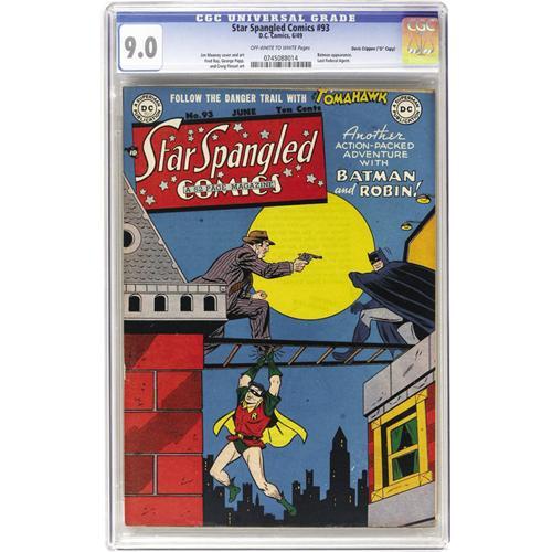<B>Star Spangled Comics #93 Davis Crippen ("D" Copy) pedigree (DC, 1949) CGC VF/NM 9.0 Off-white to white pages.</B></I> If condition is important to you (and why wouldn't it be?) you're going to love this Crippen copy! And it's got a neat cover by Jim Mooney featuring Robin and his VIP guest-star Batman. Tomahawk by Fred Ray heads the list of backup features. Overstreet 2006 VF/NM 9.0 value = $593; NM- 9.2 value = $810. CGC census 7/06: 1 in 9.0, none higher. <I>From the Crippen Collection.</B></I> <BR><BR><B>Important notice:</B> Heritage usually auctions material at the rate of 200-250 lots per hour. On some occasions eBay Live bid software or the Internet may not be able to keep up with the pace of the auction. We recommend placing a realistic absentee bid now as insurance to avoid disappointment. Occasionally the auctioneer may eliminate or reject an eBay Live bid, and the auctioneer may also reopen a lot after the close of the eBay live bidding (usually because we missed an audience bid), and may reject your bid even if it shows you as the winning bidder. By bidding via eBay Live, you agree that Heritage may award the lot to another bidder at its sole discretion under the circumstances described above or any other reasonable circumstances. Since eBay bids are not shown to us until we open the lot on the floor, we treat those bids just like floor bids. In most cases the floor responds before the eBay bid is presented to us, due to Internet lag time, so for consistency we have made it a policy that floor bids are always considered first over tie eBay live bids. Also please note that all Heritage lots purchased through eBay Live carry a 22.5% Buyer's Premium. Please make sure you read the Terms and Conditions before you bid. This lot is being auctioned in conjunction with a live floor auction by Heritage Auction Galleries. All final auction and invoice information will be supplied by Heritage Auction Galleries, and all other information should be considered preliminary. Lot:41001 <BR><BR><B>Winning Notification and Billing:</B> After the FINAL session in this auction is complete, Heritage will send e-mail and snail mail invoices. This process normally takes several days. All final auction and invoice information will be supplied by Heritage Auction Galleries, and all other information should be considered preliminary. <BR><BR>This auction will be conducted on a live auction floor and over the Internet through eBay Live. If you choose to place an absentee bid, please take a moment to <font color='#0000ff'><u><a href='http://pages.ebay.com/liveauctions/help/before/laabsentee.html'>learn how eBay Live absentee bidding works</a></u></font><font color='#000000'>