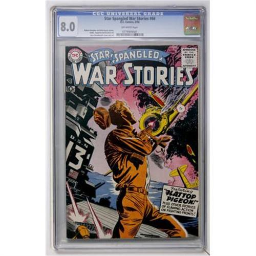 <B>Star Spangled War Stories #66 (DC, 1958) CGC VF 8.0 Off-white pages.</B></I> Ross Andru, Mike Esposito, and Mort Drucker art. Jerry Grandenetti cover and art. Overstreet 2007 VF 8.0 value = $67. CGC census 6/07: 1 in 8.0, none higher. <I>From the Keith Marlow Collection.</B></I><BR><BR><b>Shipping:</b> Comics - Slabbed (certified) (<a target="_blank" href="http://www.heritageauctions.com/common/shipping.php">view shipping information</a>)