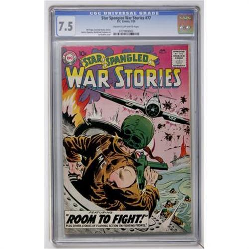 <B>Star Spangled War Stories #77 (DC, 1959) CGC VF- 7.5 Cream to off-white pages.</B></I> Joe Kubert cover. Ross Andru, Mike Esposito, and Russ Heath art. Overstreet 2007 VF 8.0 value = $67. CGC census 6/07: 1 in 7.5, none higher. <I>From the Keith Marlow Collection.</B></I><BR><BR><b>Shipping:</b> Comics - Slabbed (certified) (<a target="_blank" href="http://www.heritageauctions.com/common/shipping.php">view shipping information</a>)