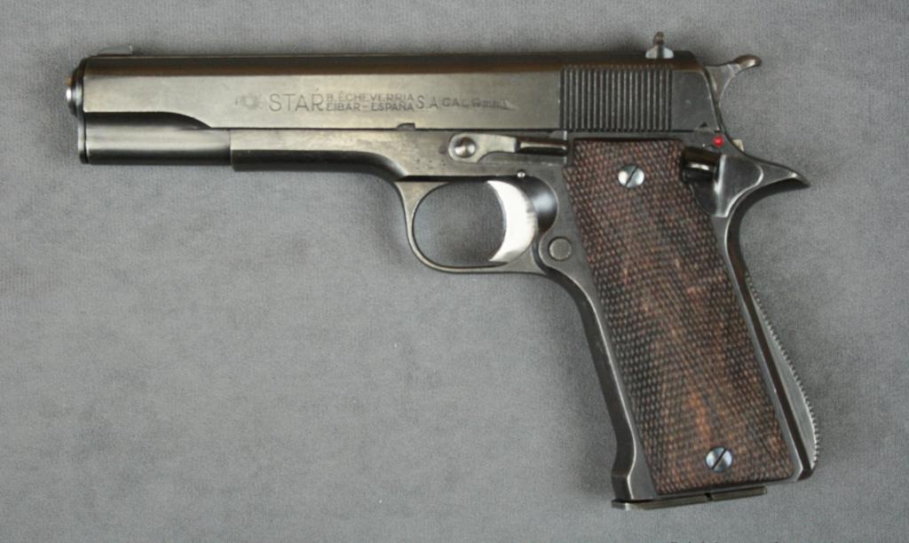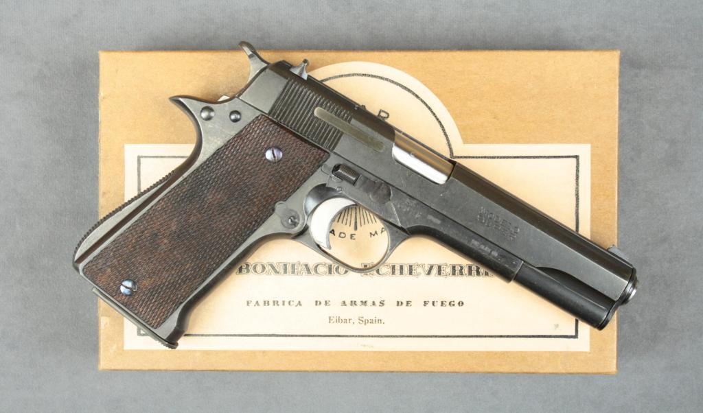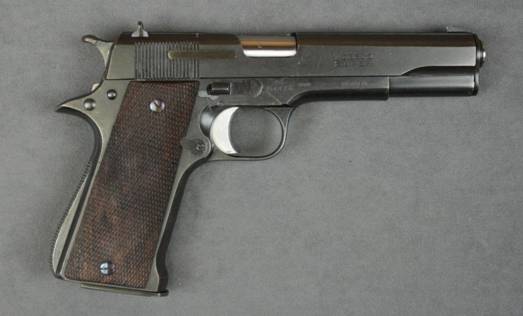 Star Super Model semi-auto pistol, 9mm cal., 5” barrel, black finish, import marked, checkered wood grips, #343167 with extra magazine, instructions and Interarms cardboard box. This gun is in overall verygood condition as re-furbished showing majority of re-blue, very good bore, action, markings and wood. Est.: $250-$500.
