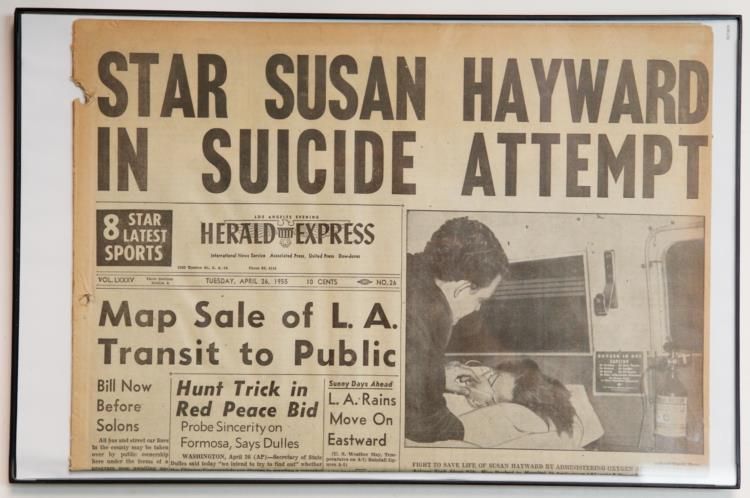 We present you with a framed front page newspaper headline from the Los Angeles Evening Herald Express, "Star Susan Hayward in Suicide Attempt," published on April 26, 1955. This clipping is mounted in an 11" x 17" black frame and comes from an estate collection. This tragic headline portrays one of the many woes of Hollywood's finest.