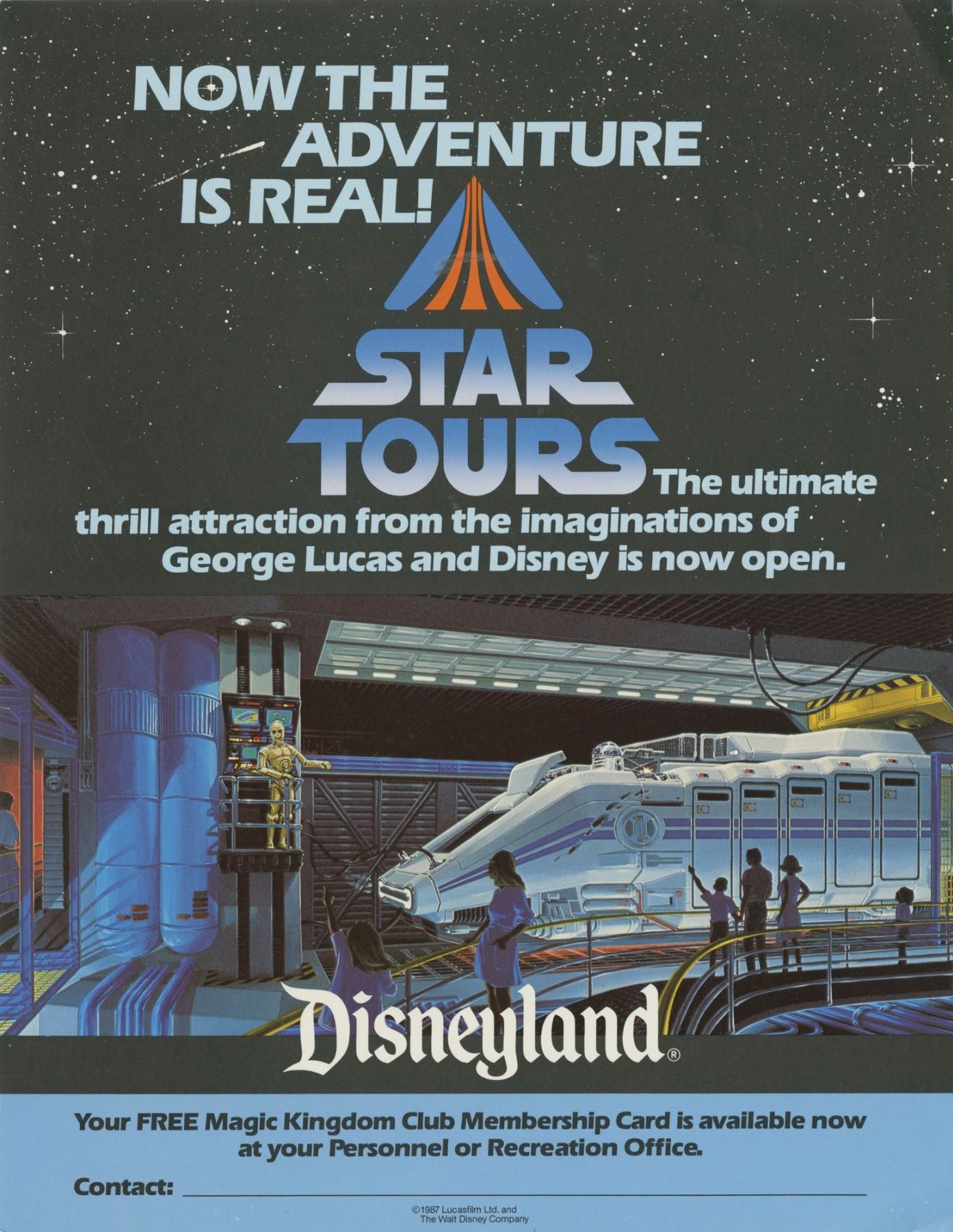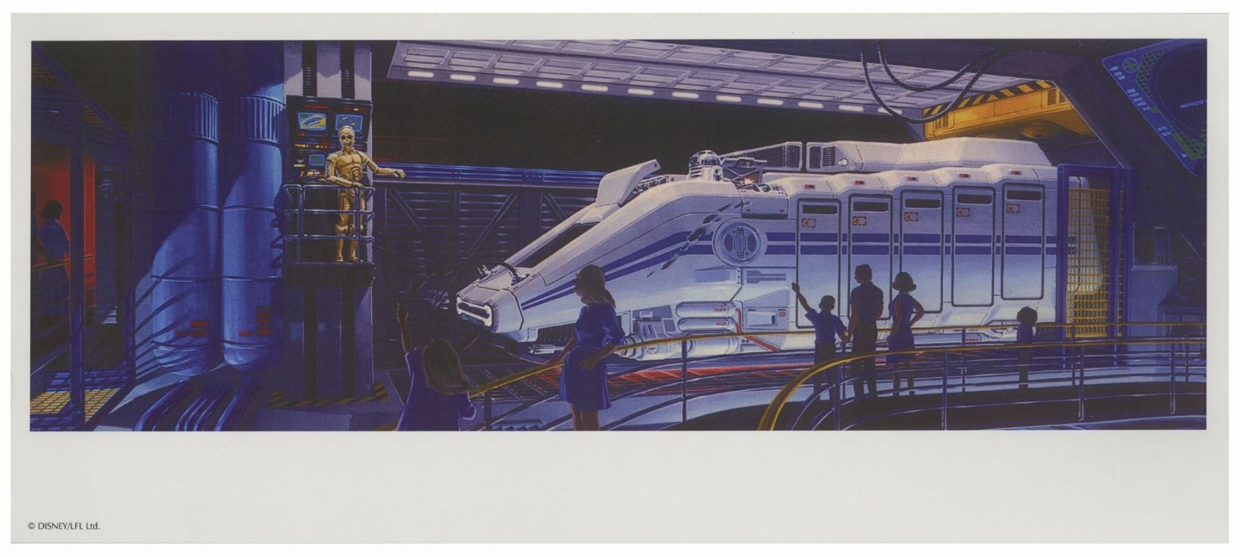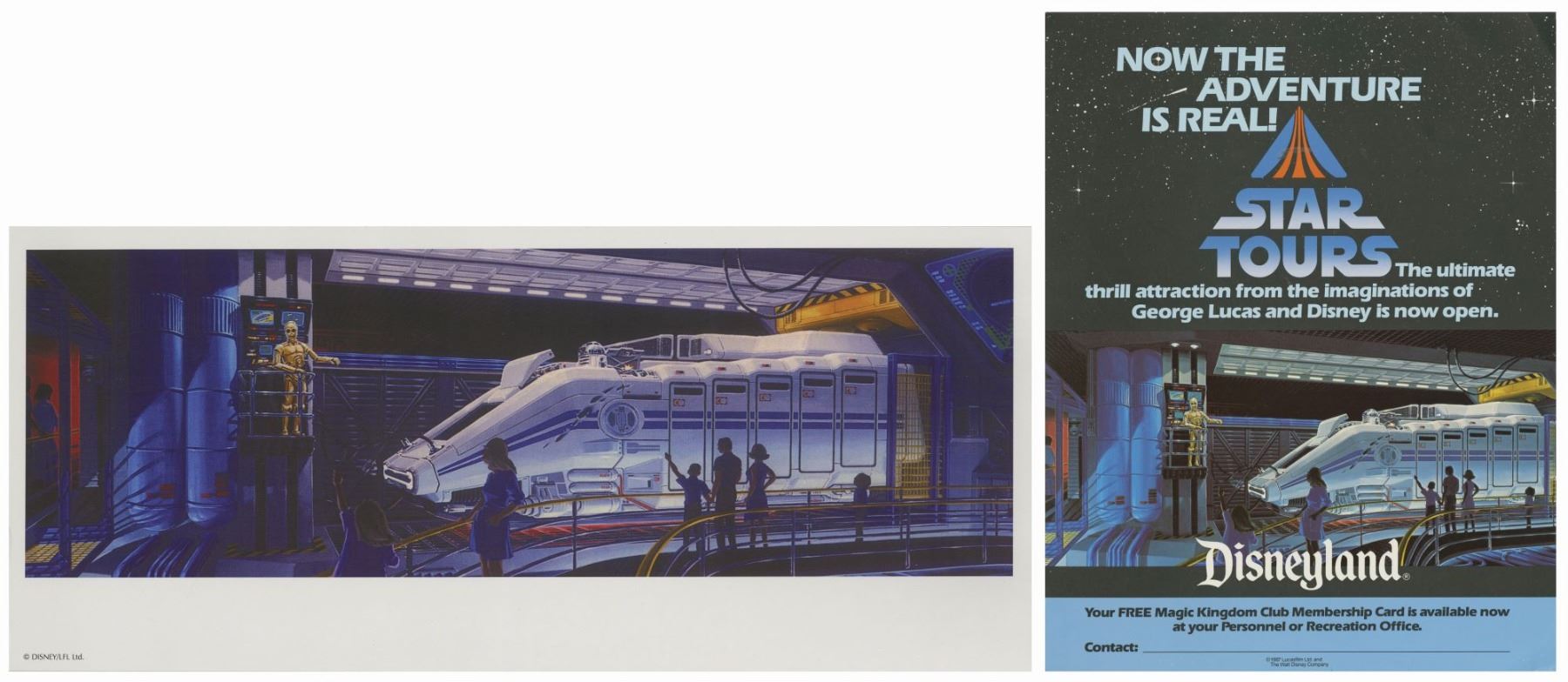(Disneyland, 1987) A concept print and promotional flyer created for the opening of the Star Tours attraction. The concept artwork features imagery that was used for the attraction and then later used for the promotional flyers. The flyer measures 7.5"x17" and the concept artwork measures 11"x8.5". These items are in very good condition with minor wear.