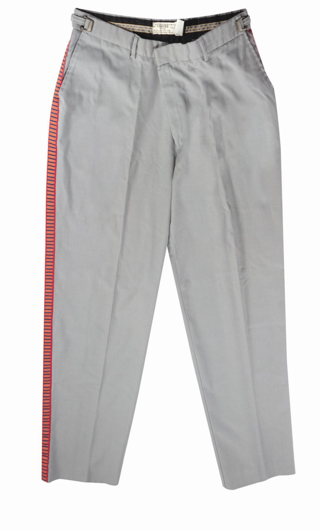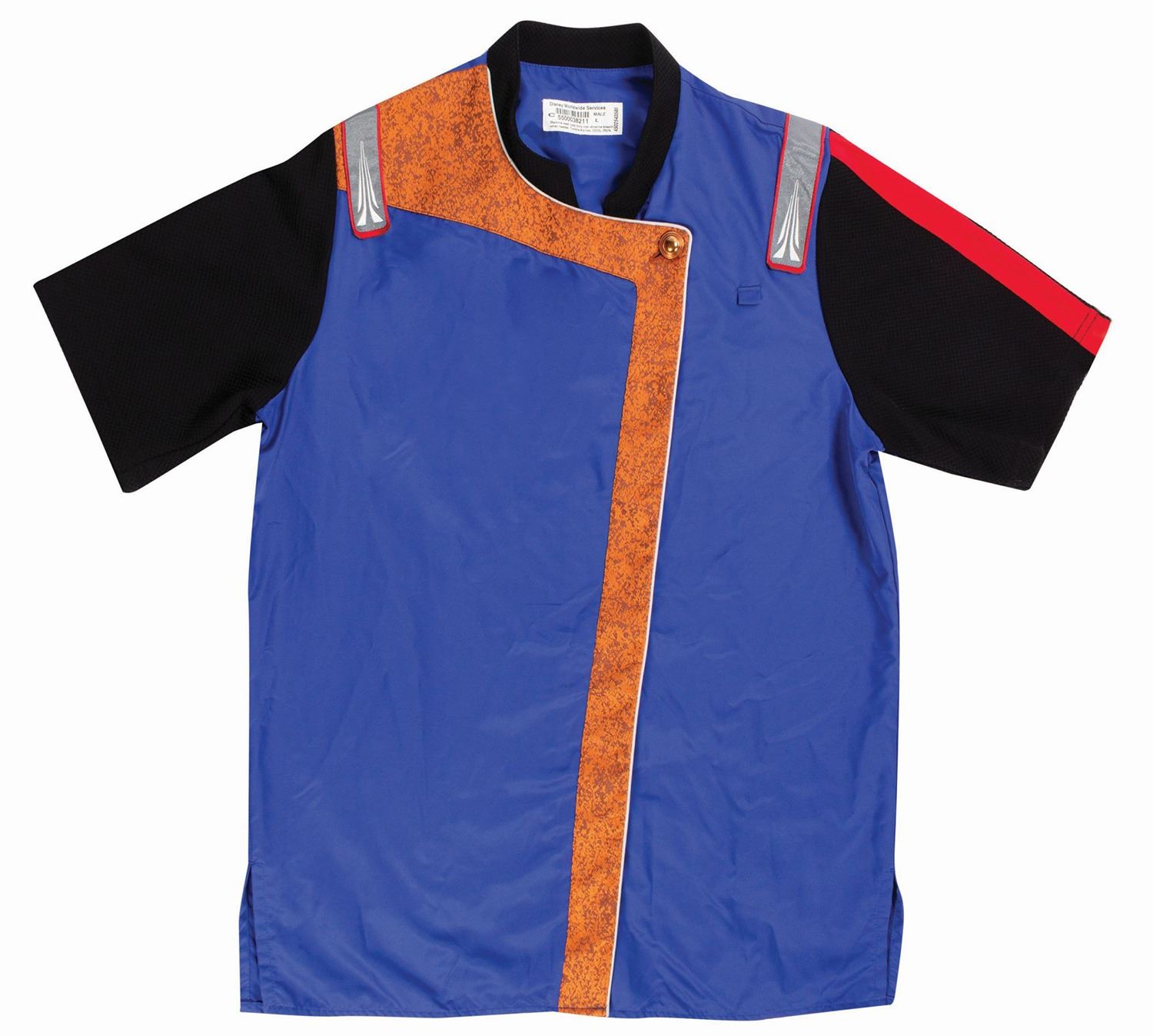 (Disneyland, 2011) A male cast member costume from the "Star Tours: The Adventures Continue" iteration of the popular attraction. This 2-piece costume includes a stylized tunic with vertical Star Tours logo epaulets on both shoulders, and a pair of gray trousers. Both garments retain internal Disney Worldwide Services barcode labels. The tunic is a size L and the pants are marked X34. The tunic and the pants are in very good condition with only minor wear and a few loose threads.